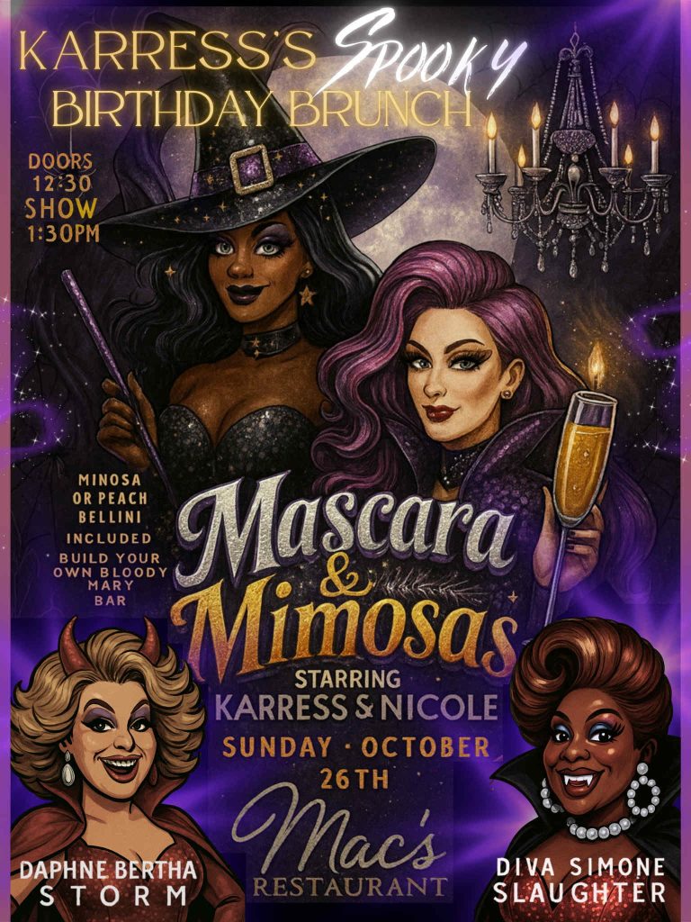 Brunch-is it lunch? Is it breakfast? All we know is that the drag queens of Eugene will be serving it up raw.! karress and Nicole and the whole drag bunch will be very honored if you come and support. Doors open at 12:30pm show starts at 1:00pm and Macs is putting out one hell of a brunch menu. $20 mimosas caraffes $15 build your own bloody Mary Bar tickets are $15 at the door- includes your first bubbly drink!! Remember to bring your singles to tip the queens